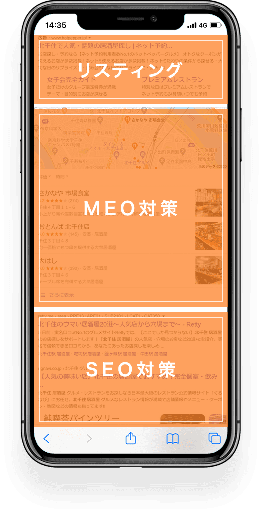 MEOとは、『Map Engine Optimization』の略称で、Googleマップでの検索(ローカル検索)にて自社の店舗情報やビジネス情報を検索ユーザーに見つけやすく施策をし、競合他社の店舗情報より上位に表示されるよう対策をすることを指します。