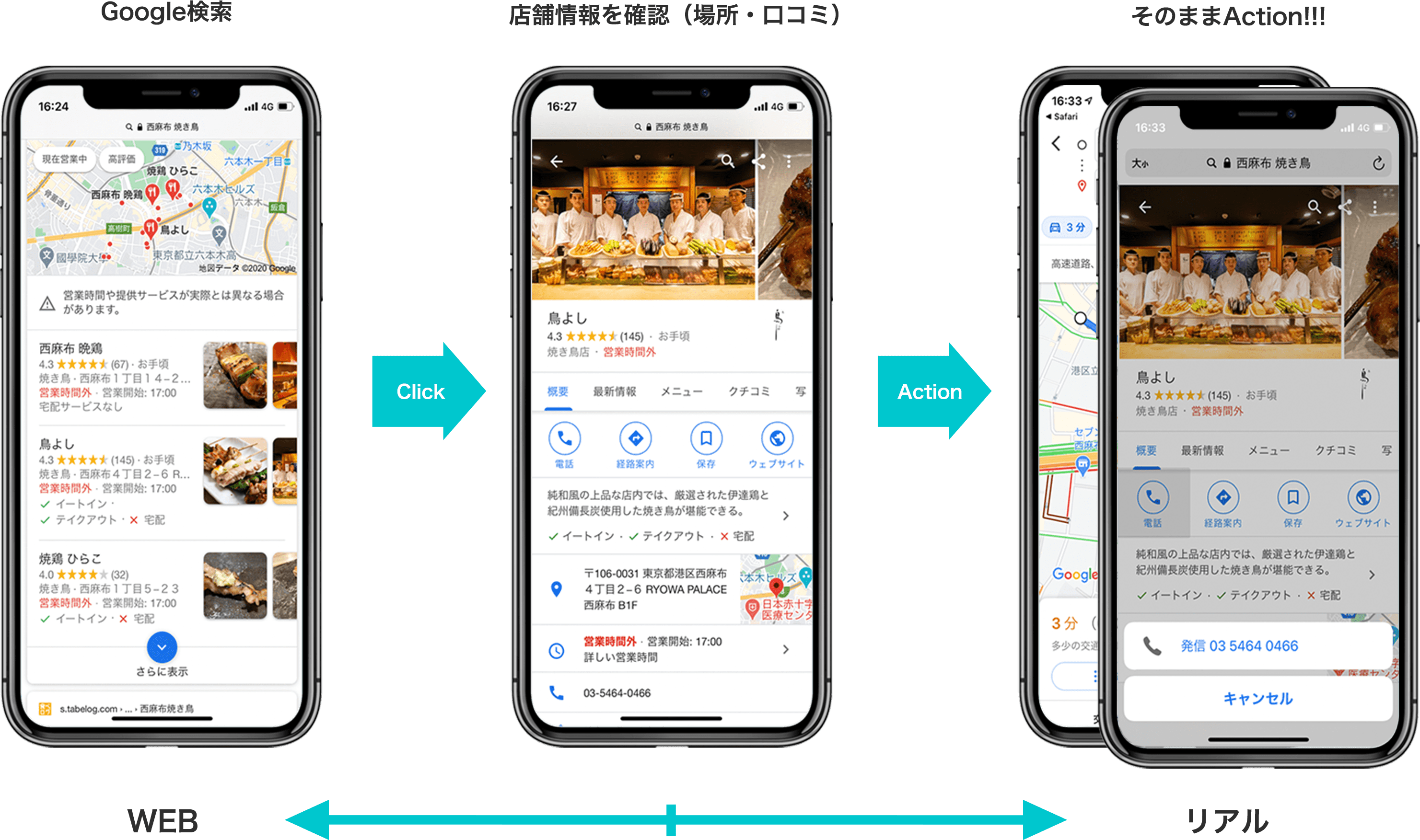 Google検索で、『熱海+ランチ』、『熱海駅+カフェ』など『地域名+業種』、『駅名+キーワード』で検索すると、検索結果の上位Googleマップの下に店舗情報が表示されます。このエリアが、Googleマップ専用エリア(ローカル検索エリア)となります。
