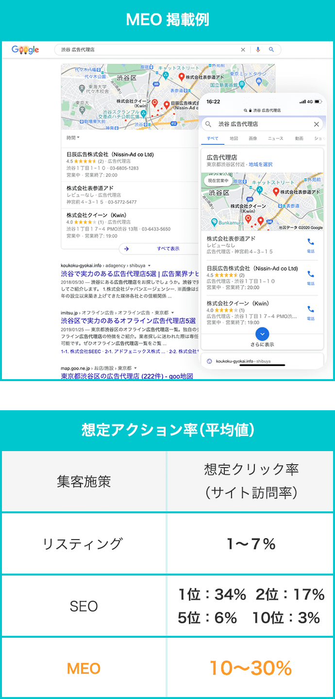 MEOは、店舗概要や口コミ(レビュー)、ルート、ホームページ、営業時間、電話番号などを表示することが可能です。ユーザーがすぐに予約できる情報を露出することで来店へ誘導することができます。